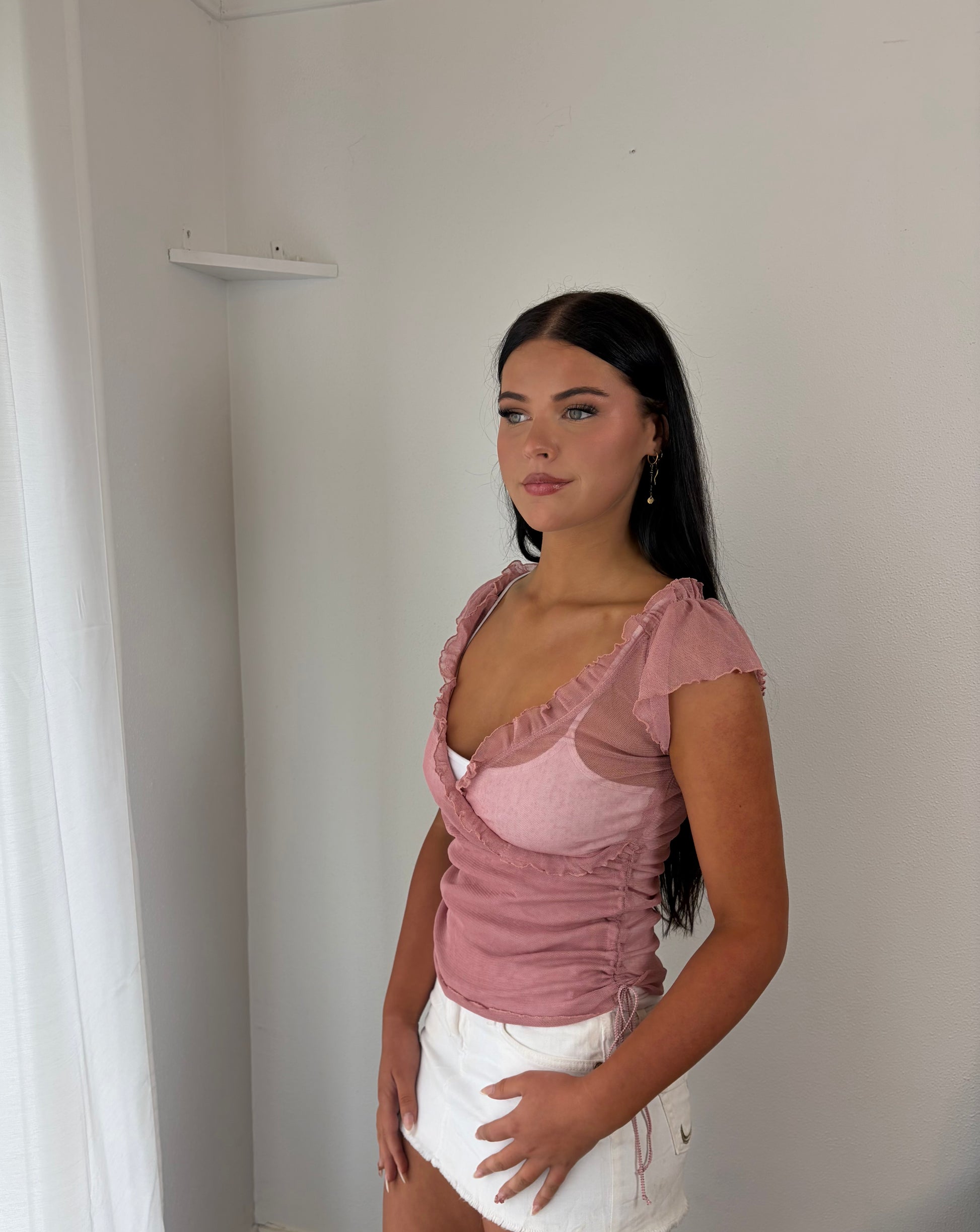Soft, airy, and effortlessly chic, this light pink sheer crossbody top features a tie detail on the sides that creates a flattering scrunched effect. Perfect layered over a white singlet or bralette, it offers a breezy, lightweight fit while adding texture and movement to your outfit. Feminine, versatile, and effortlessly stylish, it’s ideal for casual days or soft, layered summer looks.