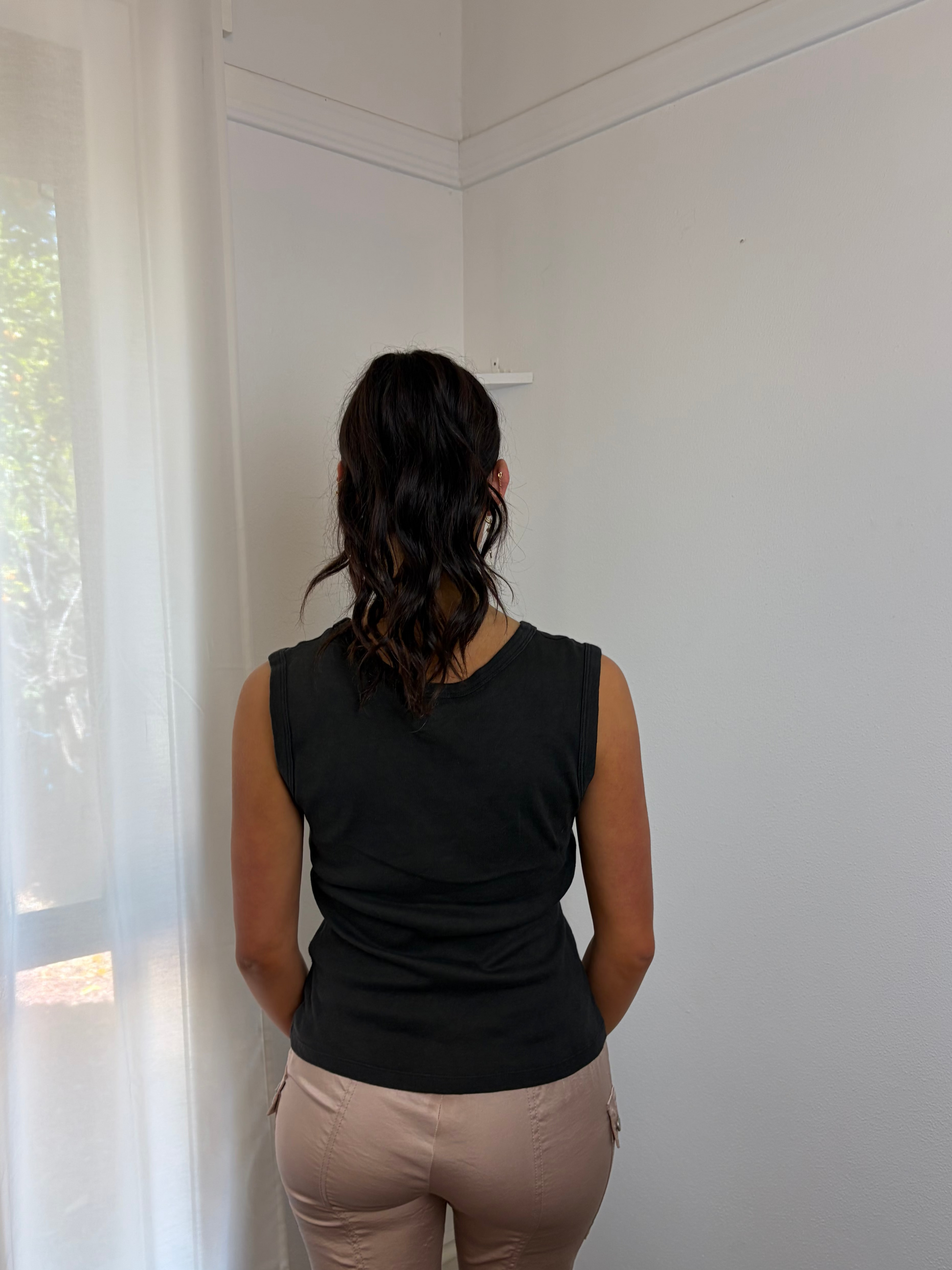 DKNY black tank top elevated with subtle diamonte embellishments. A versatile essential that works equally well layered under blazers or worn as a standalone.
