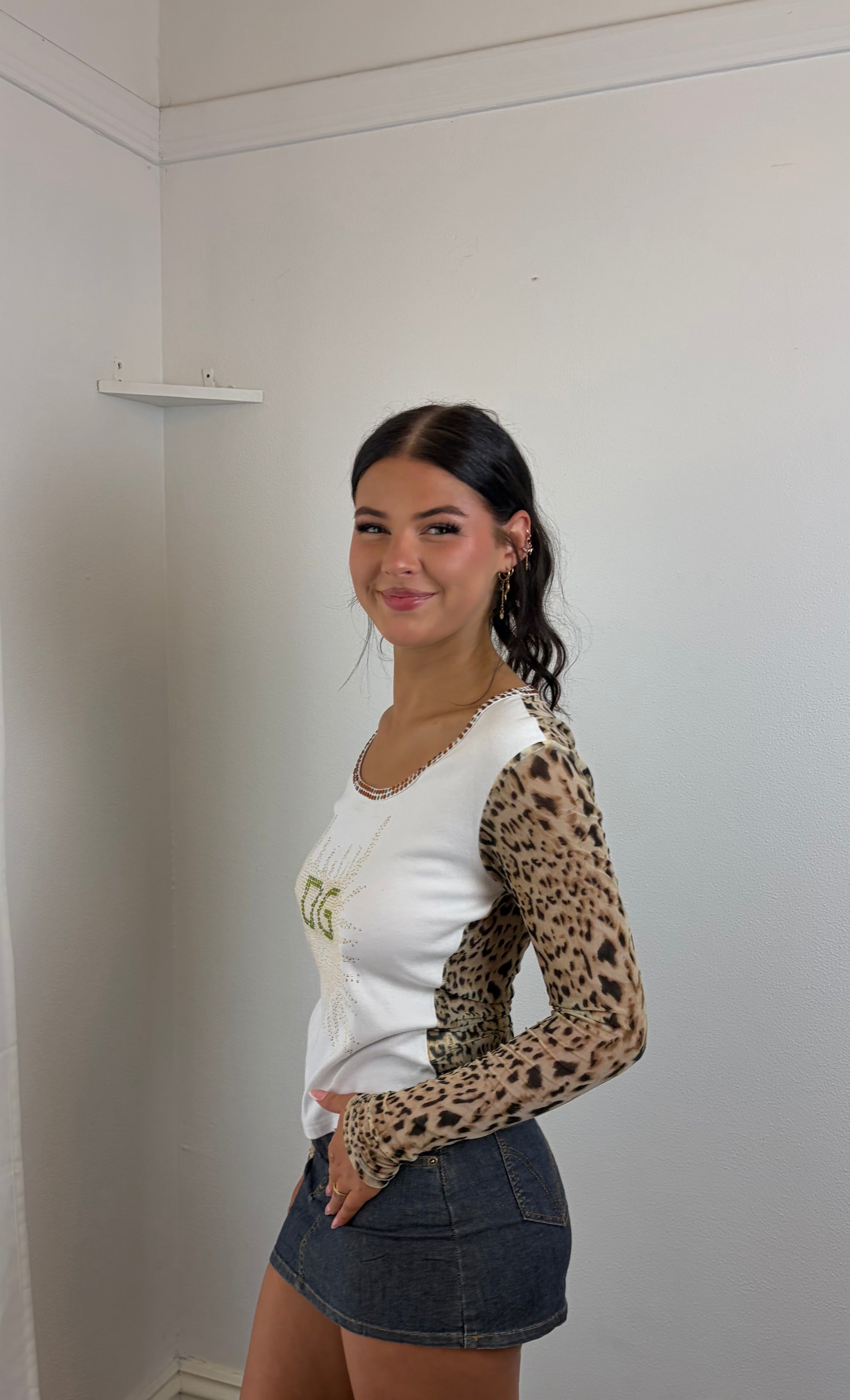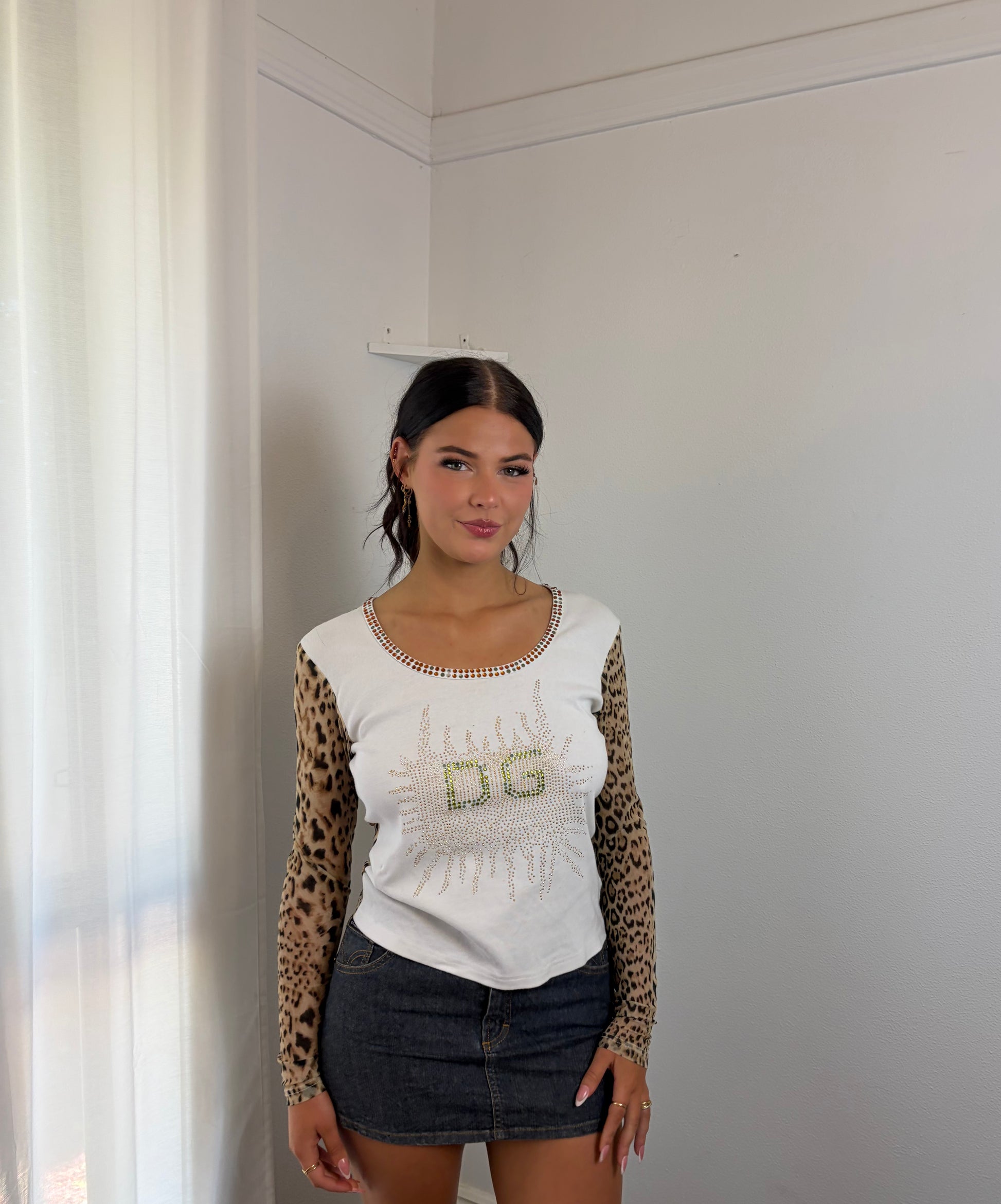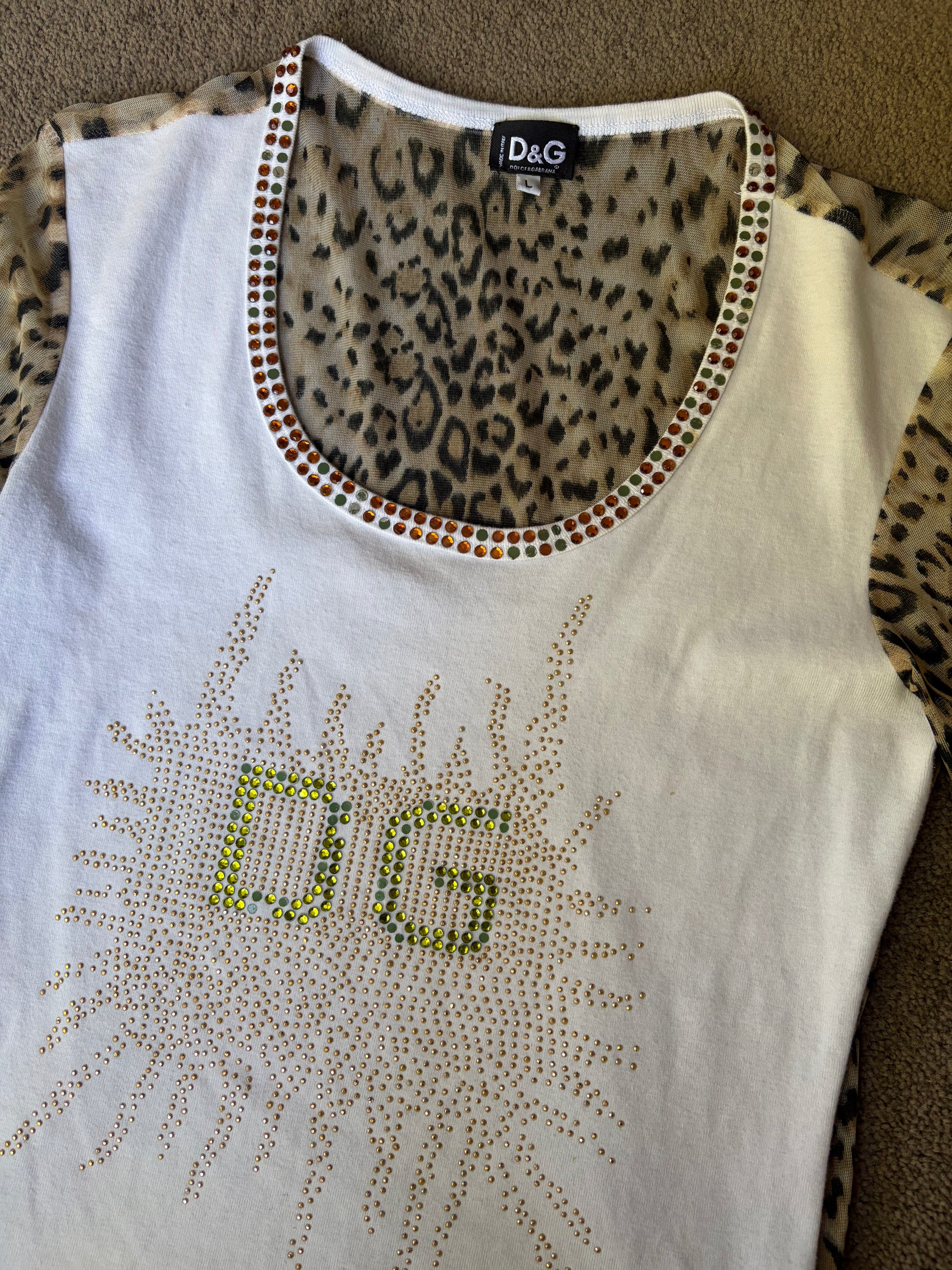 Elevate your wardrobe with this striking Dolce & Gabbana piece, featuring a crisp white base elevated by bold leopard print sleeves and back. The front showcases intricate diamante logo detailing that catches the light with every movement, adding a touch of luxury and sophistication. Perfect for those who appreciate high-fashion statement pieces that blend classic elegance with contemporary edge.