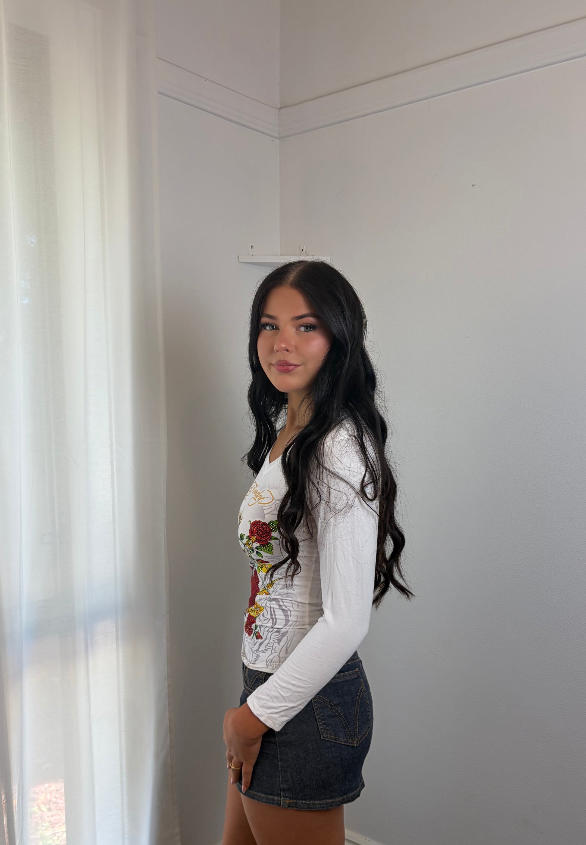 Soft, lightweight, and effortlessly stylish, this white Ed Hardy V-neck long sleeve top is perfect for layering or wearing on its own. Classic design meets vintage streetwear vibes.