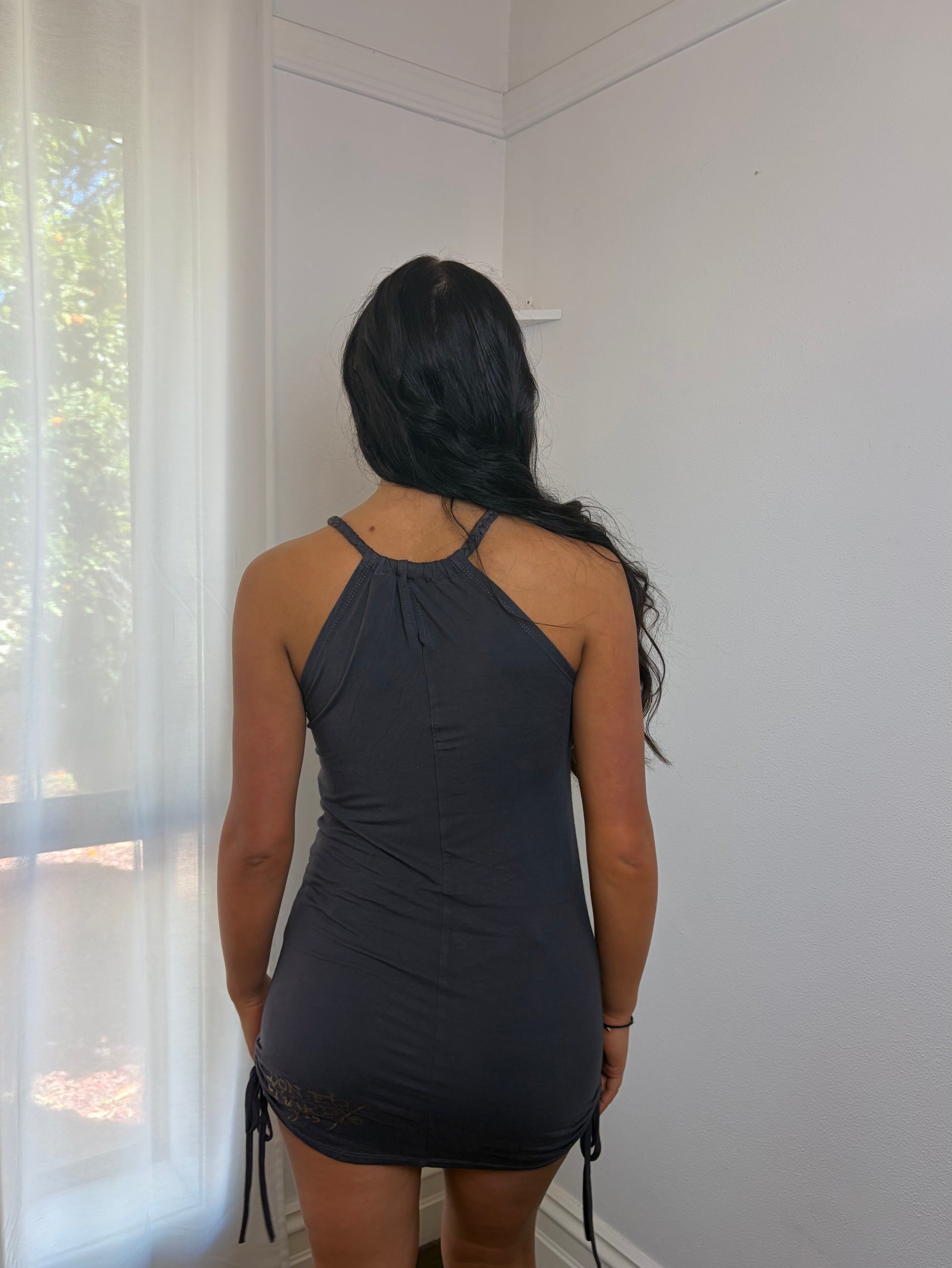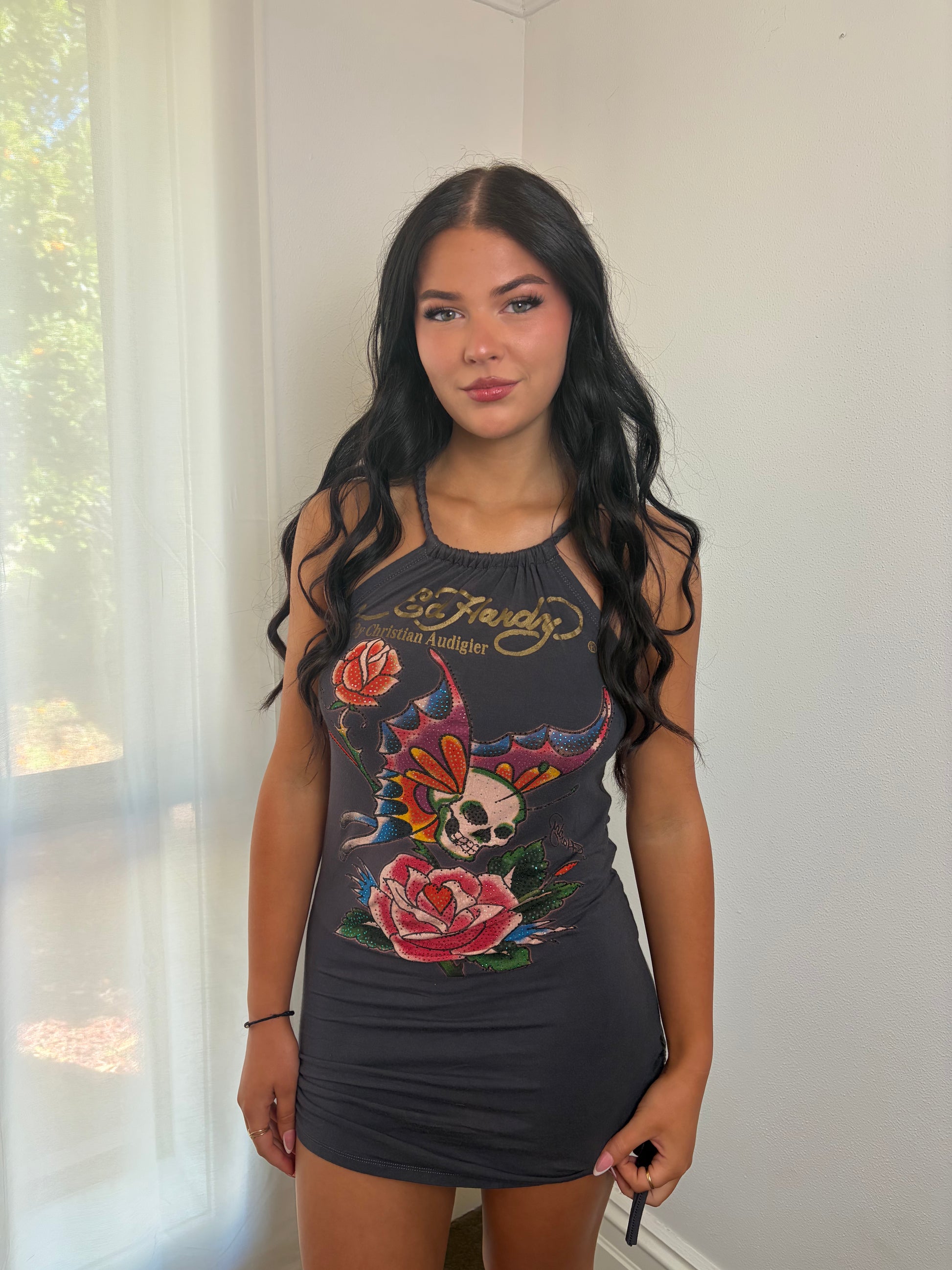 Soft grey Ed Hardy dress designed for a flattering fit with adjustable sides. Easy to wear and versatile, this dress combines comfort with iconic vintage streetwear style.