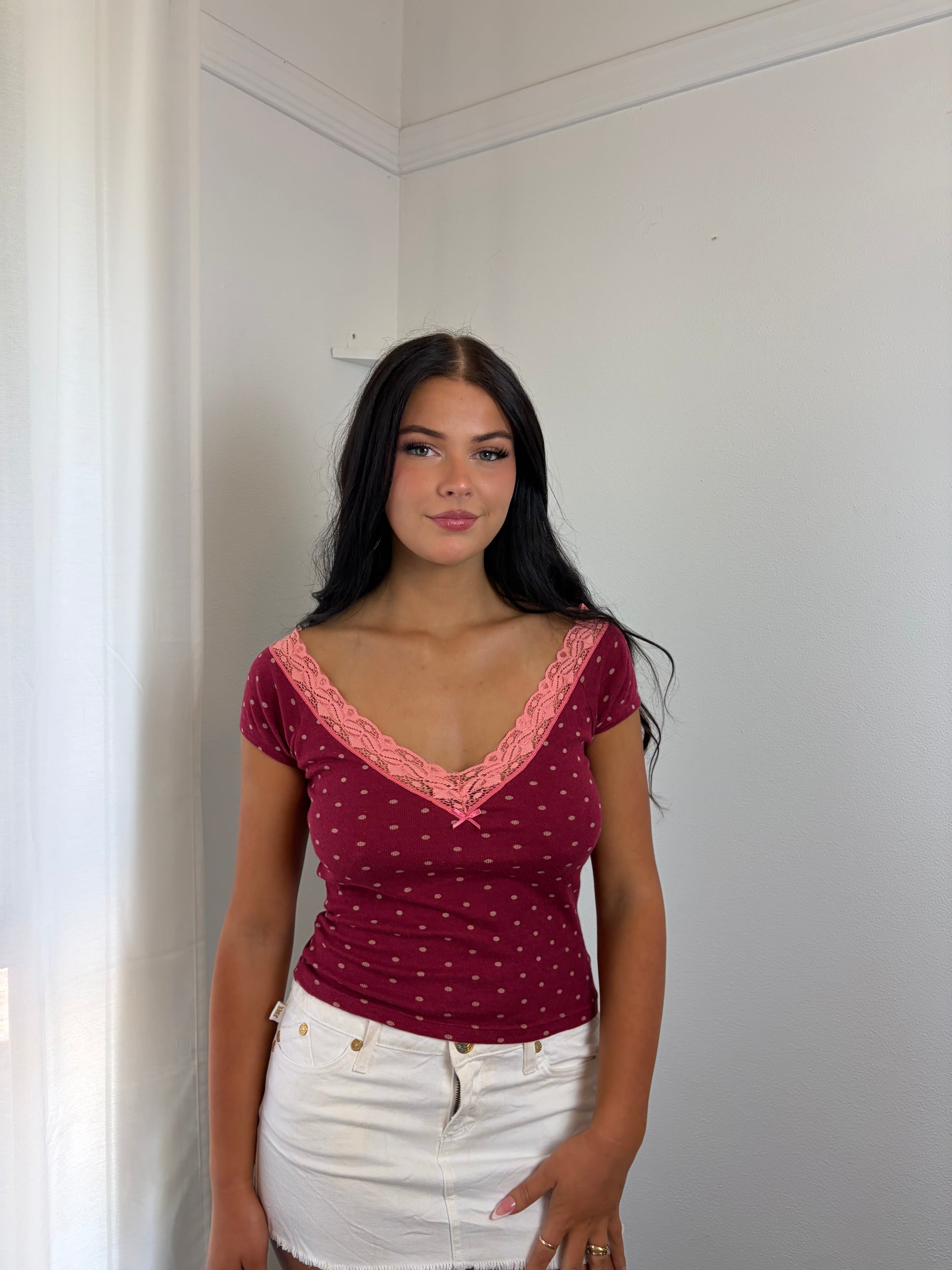 Giving major 2000s energy - this cherry red and pink polka dot cami is pure Kookai nostalgia. Soft, breathable cotton, lace trim, and a tiny bow tie make it the ultimate flirty throwback piece. Style it up with a mini or keep it casual with baggy jeans.