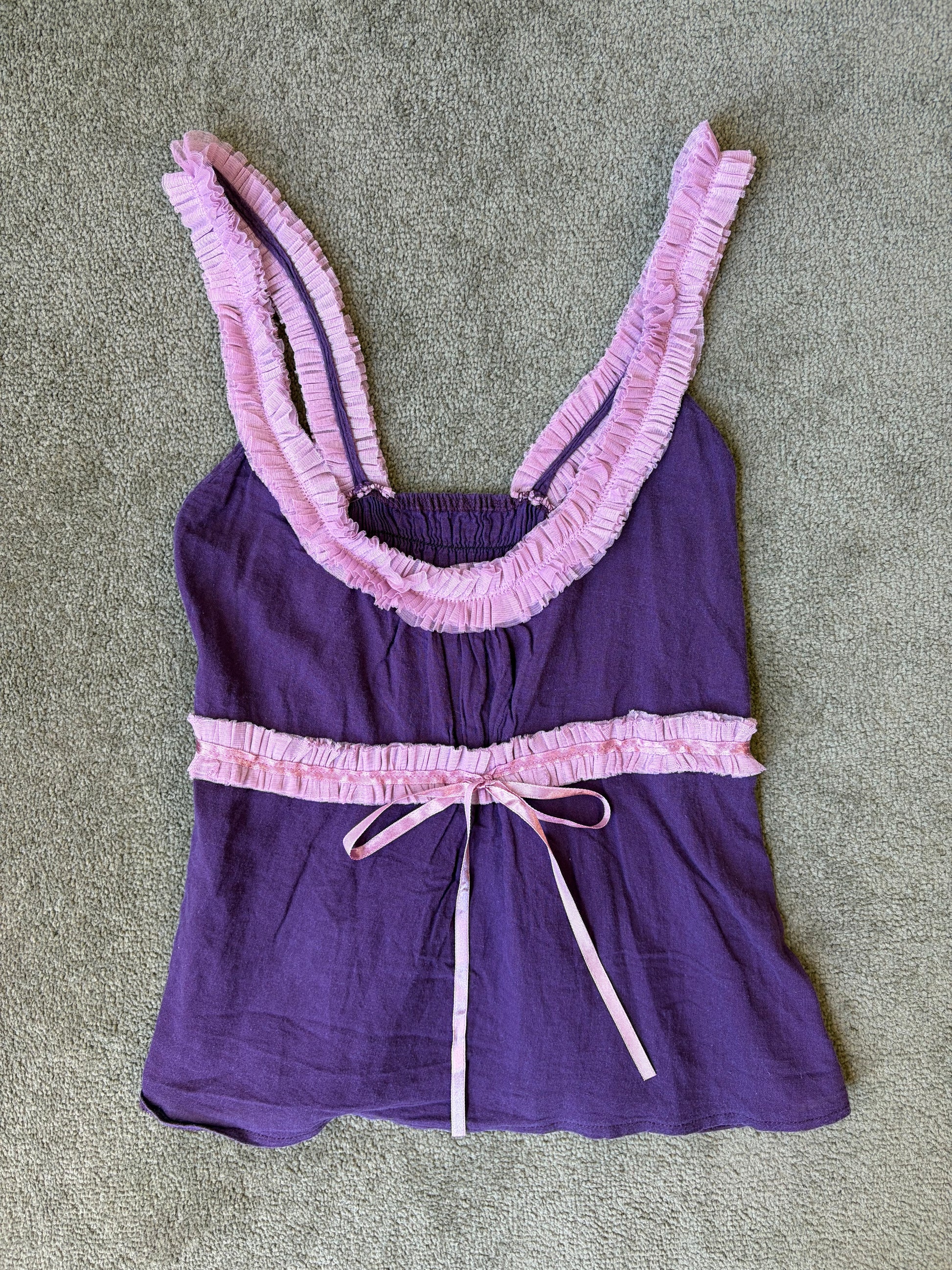 Effortless summer elegance in a soft, flowing purple singlet designed for warm-weather comfort. Delicate light purple detailing frames the neckline, while a dainty bow accent sits gracefully beneath the bust, adding a touch of refined femininity.