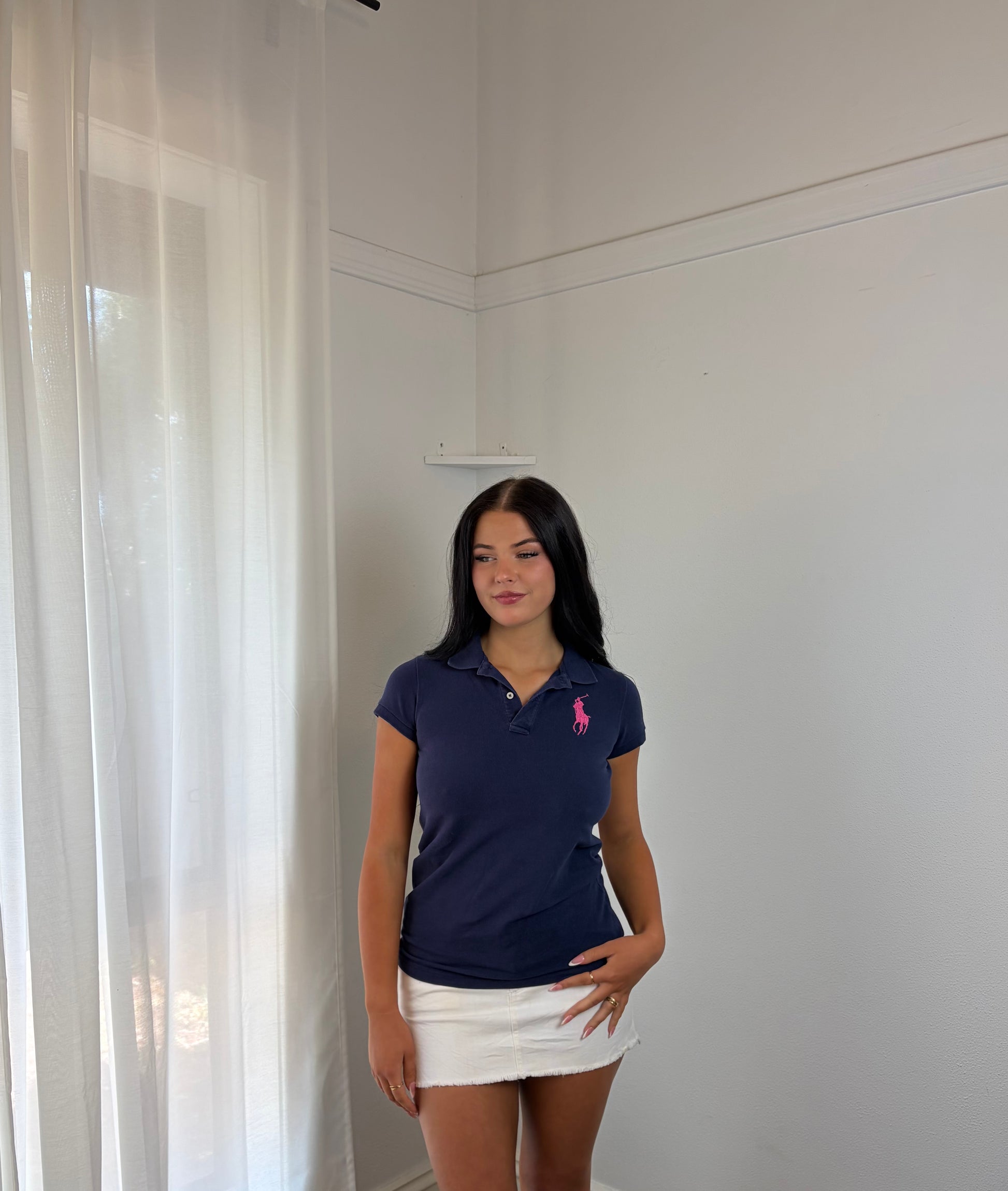 A timeless wardrobe essential, this classic navy Ralph Lauren polo shirt features the iconic pink embroidered logo that defines the brand's heritage. The structured fit and quality construction make it suitable for both casual outings and smart-casual occasions. A vintage piece that transcends seasonal trends and complements any refined collection.
