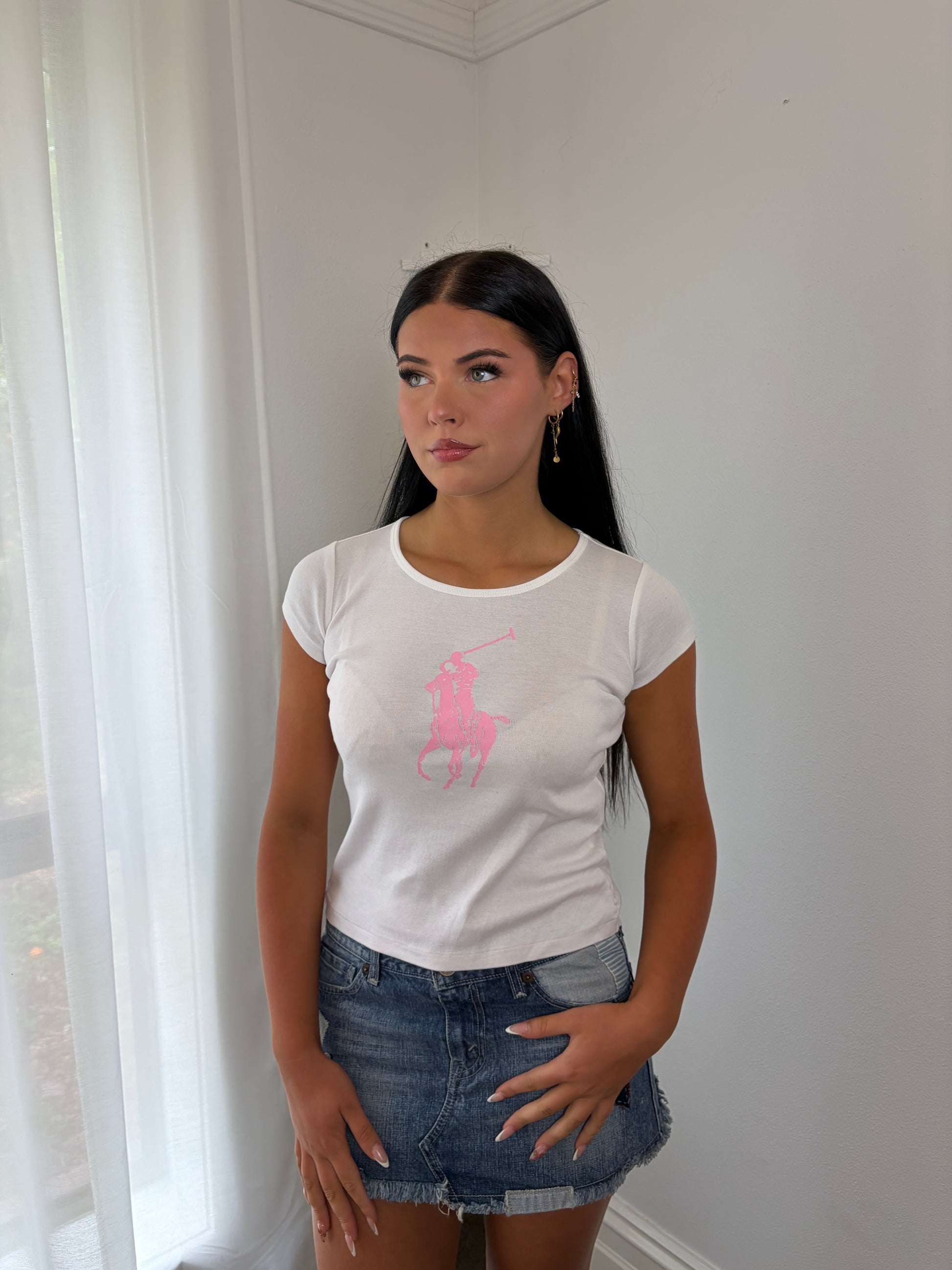 Keep it classic with this crisp white Ralph Lauren tee, featuring a soft pink logo at the centre for a subtle pop of colour. Made from breathable, comfortable fabric, this versatile tee is perfect for casual everyday wear, layering, or pairing with your favourite denim or skirts. Its timeless design ensures it’s a wardrobe staple you’ll reach for again and again.
