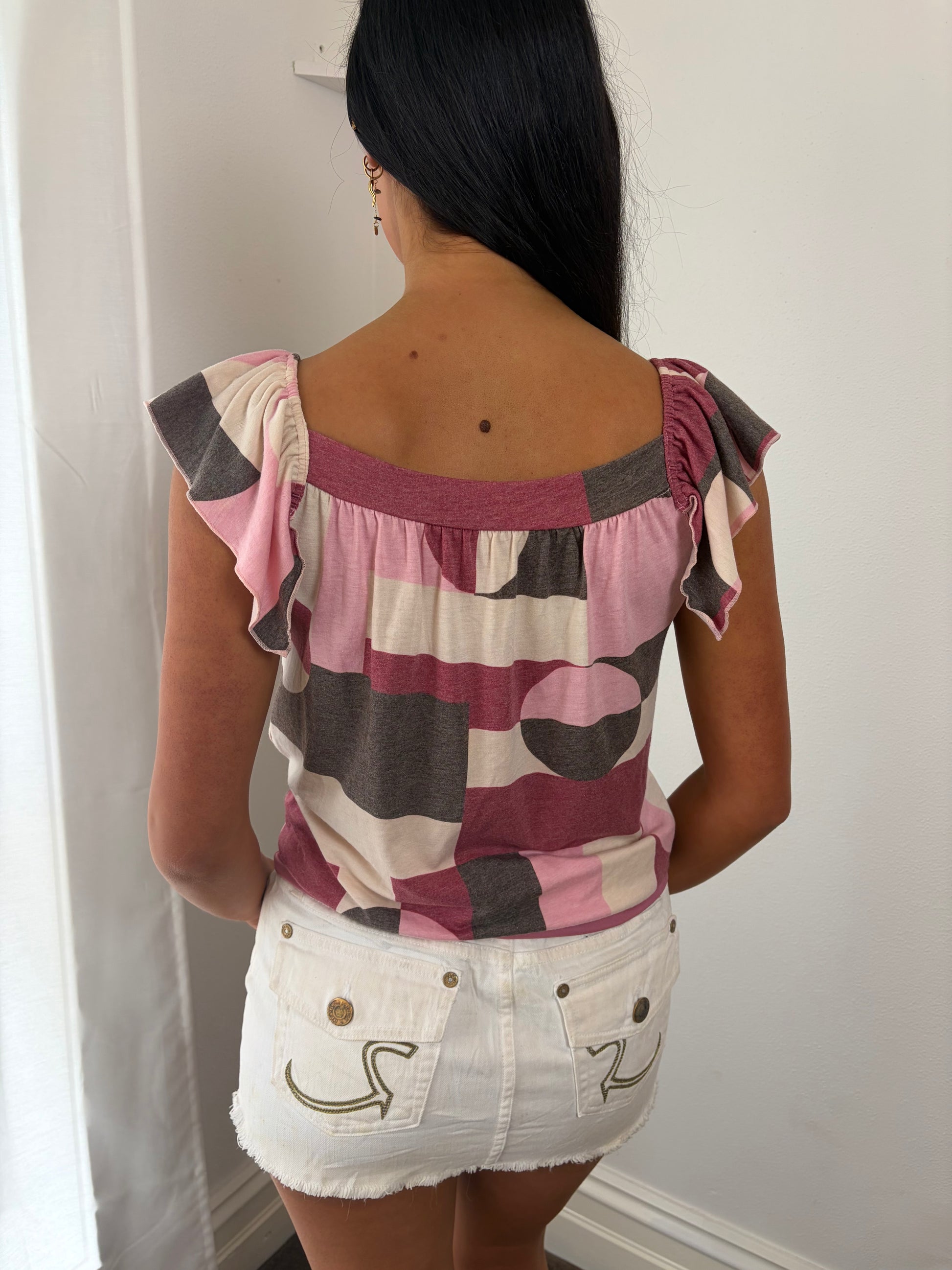 Bring back the early-2000s energy with this Y2K-ready patterned top! Featuring a 60s-inspired print in soft pink, white, and light brown, it’s designed with draped shoulder sleeves for effortless movement and a front tie ribbon at the hip for a playful, adjustable fit. Flattering and lightweight, this top gives off vintage-meets-modern vibes, perfect for layering or pairing with your favourite low-rise jeans and mini skirts.