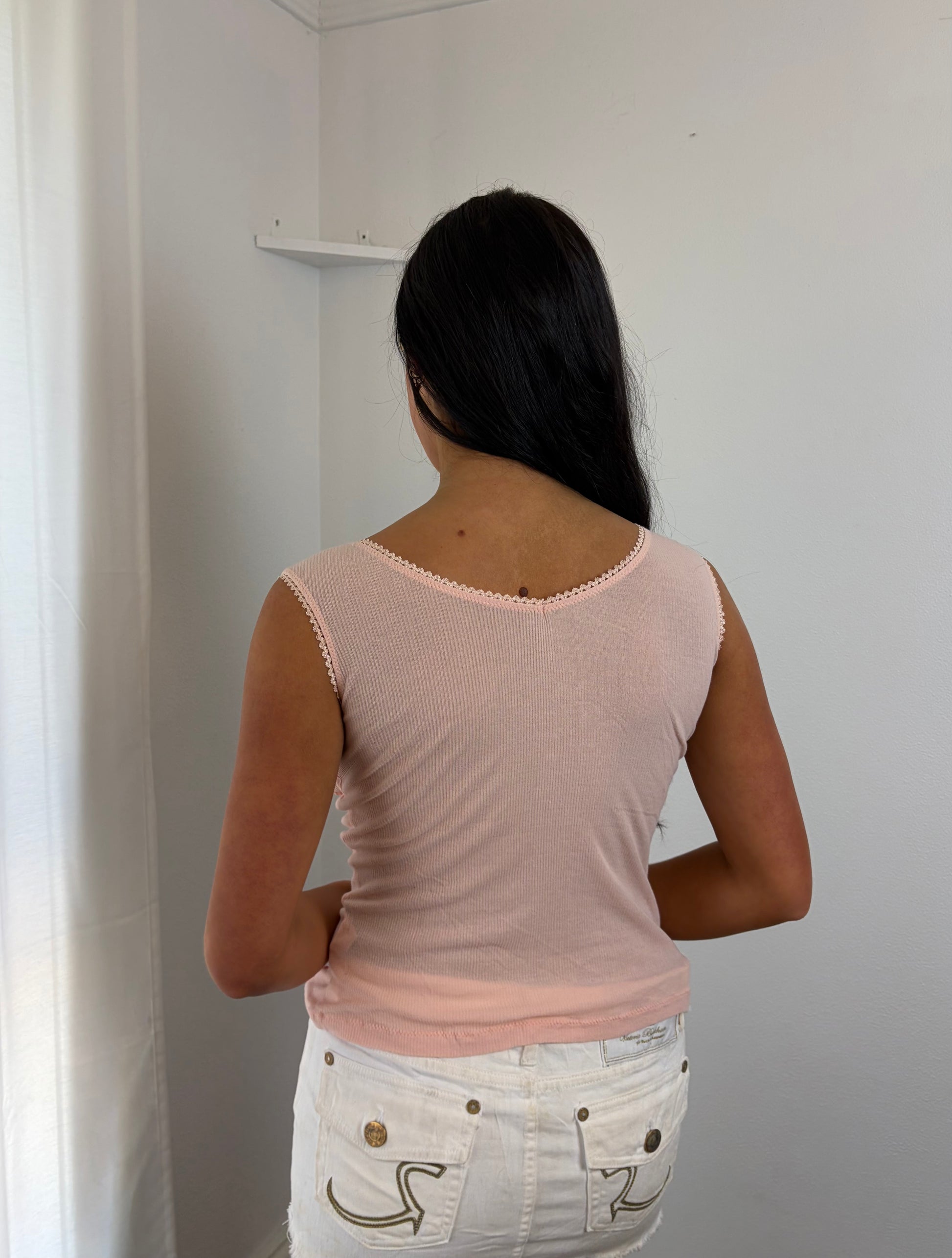 This delicate pink tank features a charming bow detail at the neckline, crafted from soft, breathable cotton that's gentle against the skin.
