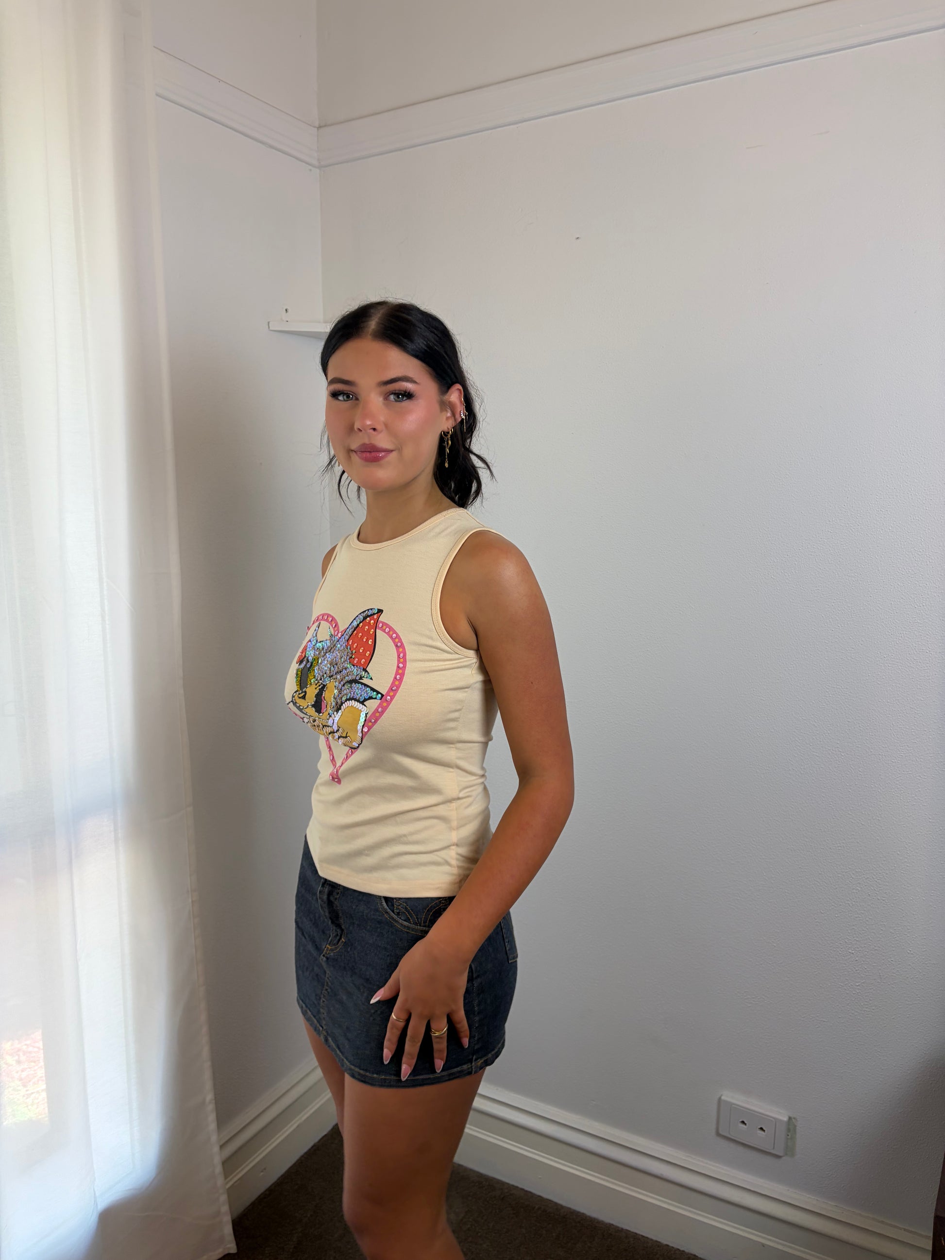 Channel early 2000s energy with this cute Tom and Jerry tank top. Features Tom with a pink love heart outline on the front - soft, fitted, and full of nostalgic charm.