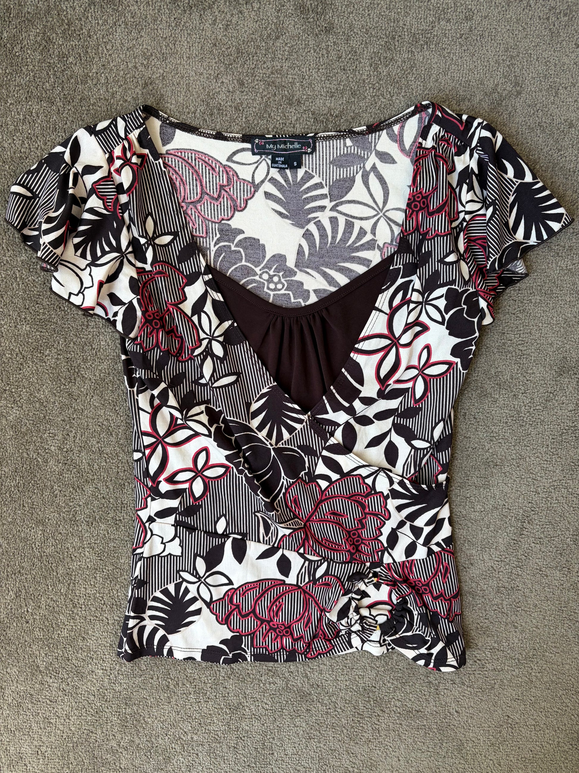 Designed to contour the body, this crossbody-style top is crafted from a stretchy fabric that offers a smooth, flattering fit. The rich tropical pattern blends brown, red, and white tones for a warm, statement look, while the fitted silhouette keeps the design sleek and modern. Comfortable yet eye-catching, this piece is ideal for elevated everyday wear or styled for warmer weather.