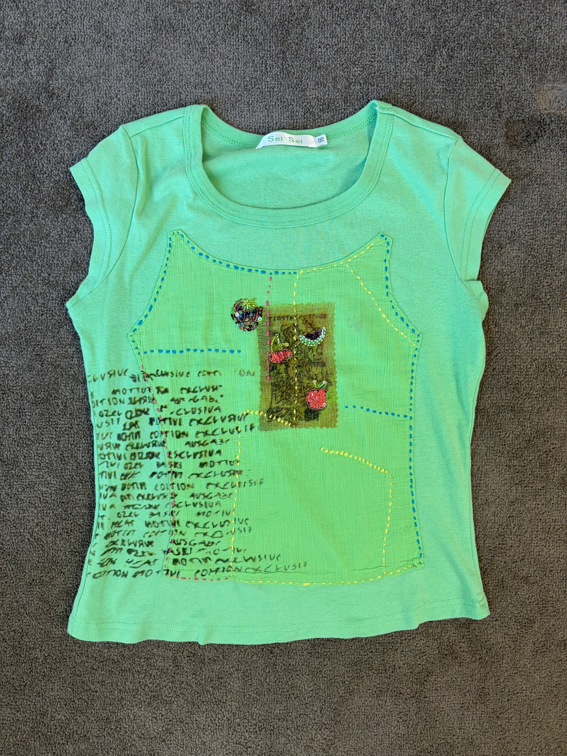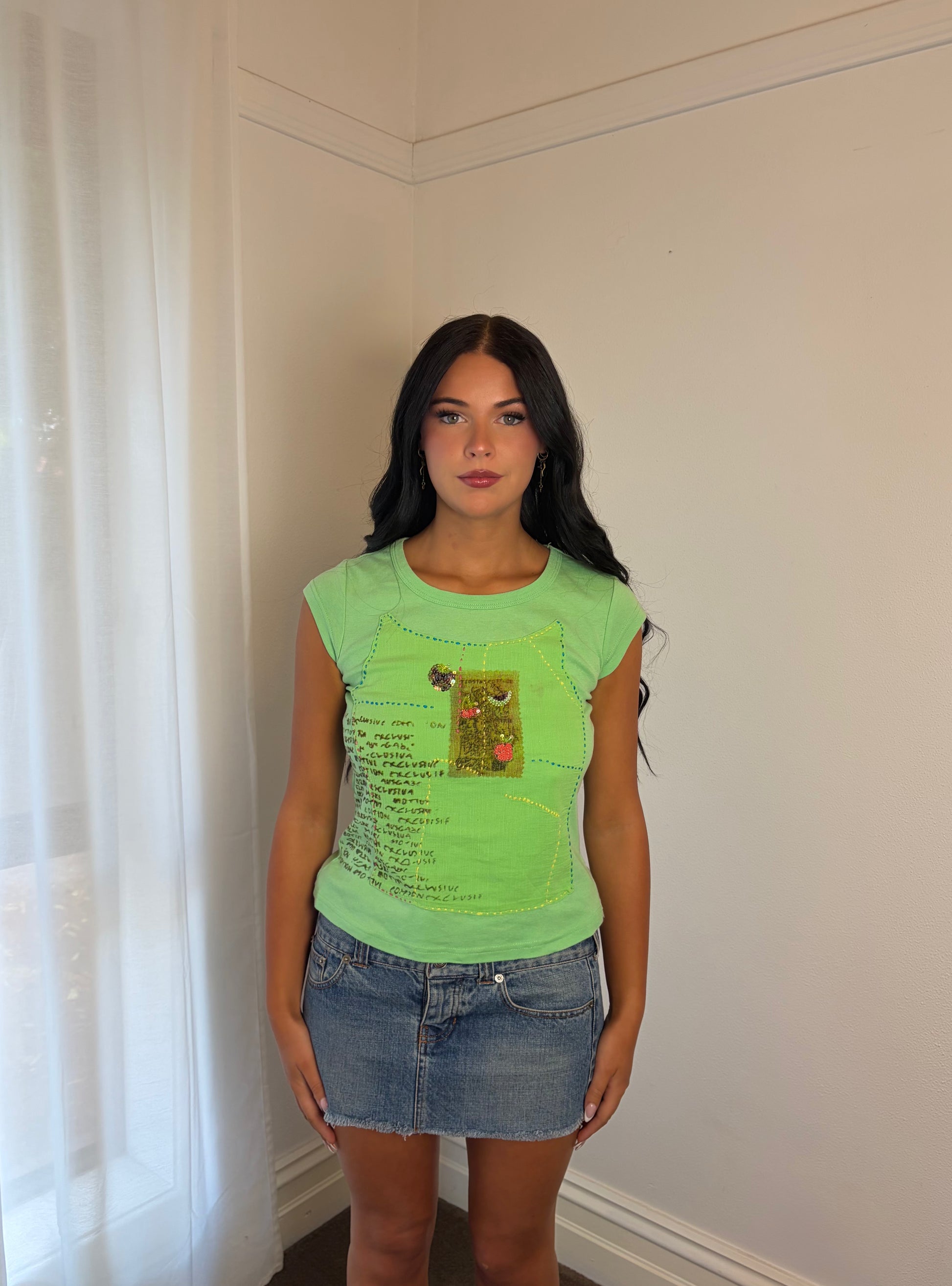 A vibrant statement from the early 2000s, the Vintage Lime Green Embellished Baby Tee celebrates individuality through colour, texture, and handcrafted detail.