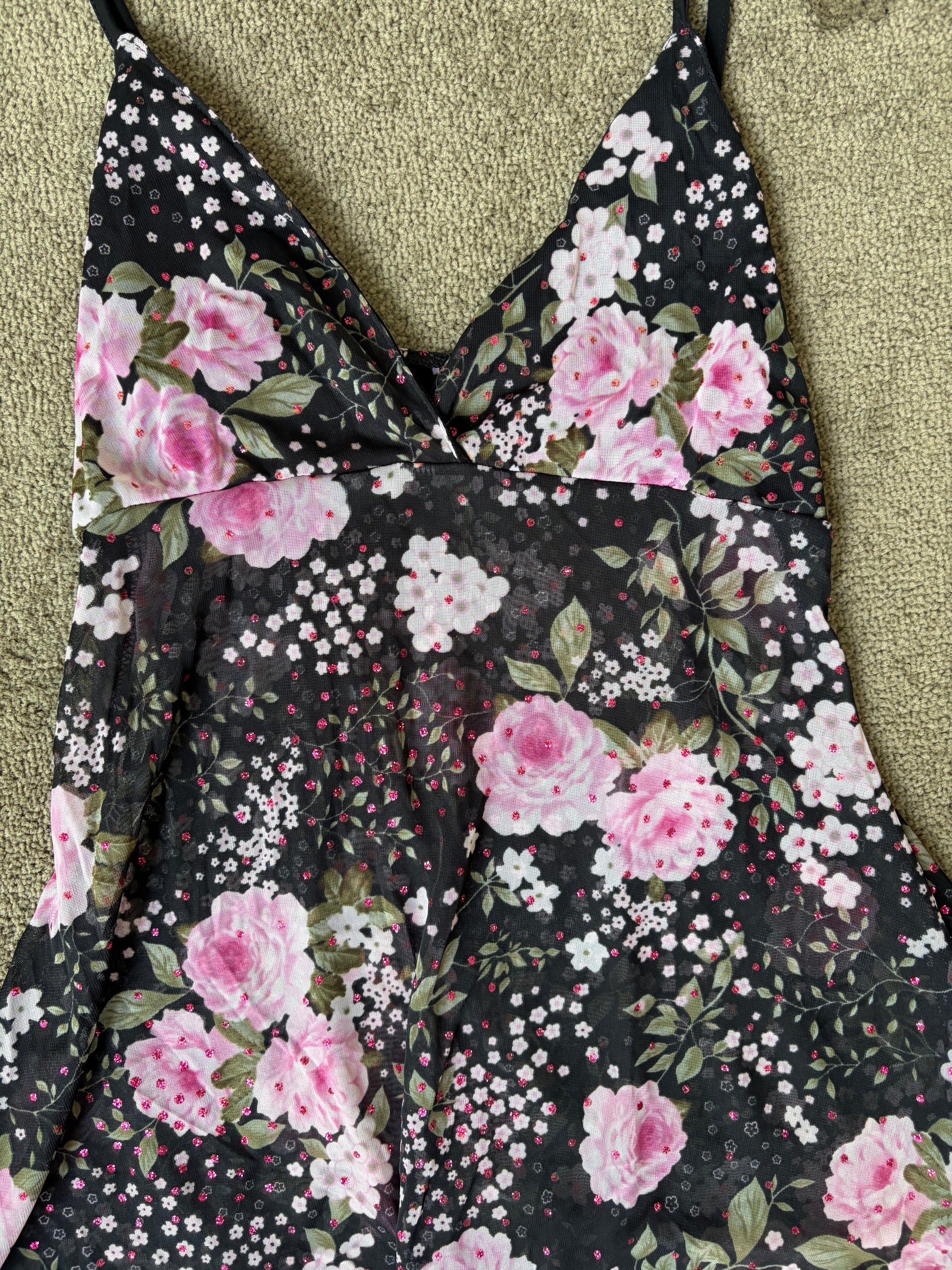This vintage Y2K floral mesh cami top is a romantic statement piece designed to flatter and captivate. Crafted from a sheer black mesh base, the top is intricately detailed with soft pink rose florals and subtle shimmer accents that catch the light with every movement.