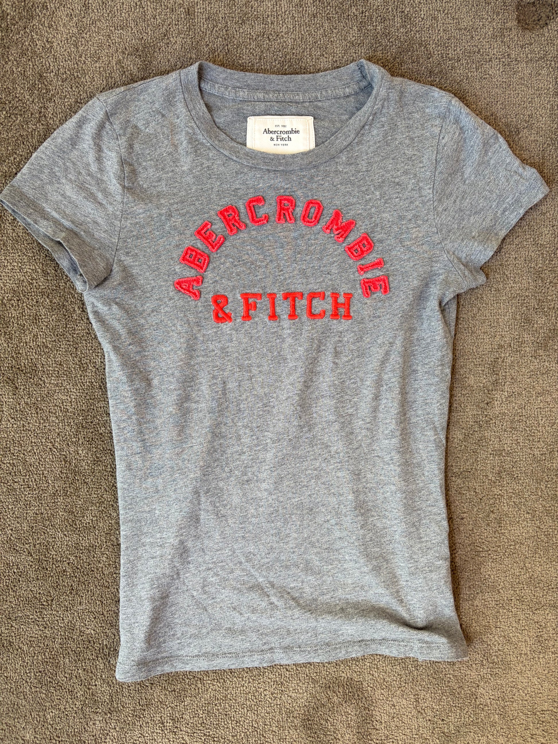 Crafted from soft grey marl cotton, this fitted baby tee features the iconic Abercrombie & Fitch logo embroidered across the chest in bold red lettering. The classic crew neckline and streamlined silhouette create an effortlessly flattering shape, making it a versatile staple for everyday wear.